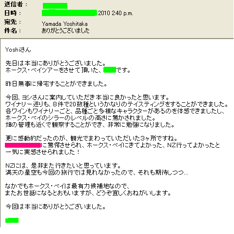 | プレゼント | ツアー中にお選びいただいた、お好みワインを1本プレゼント! ただし1本NZ$35以下とさせていただきます。 (十分このお値段で美味しいワインがあります!) |